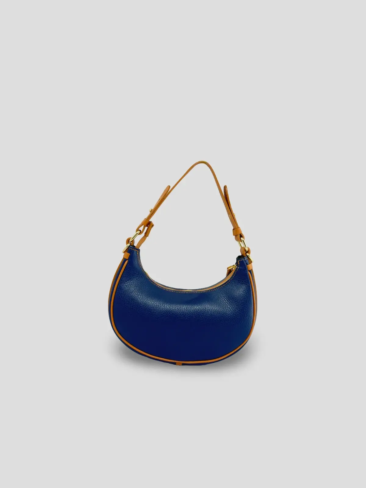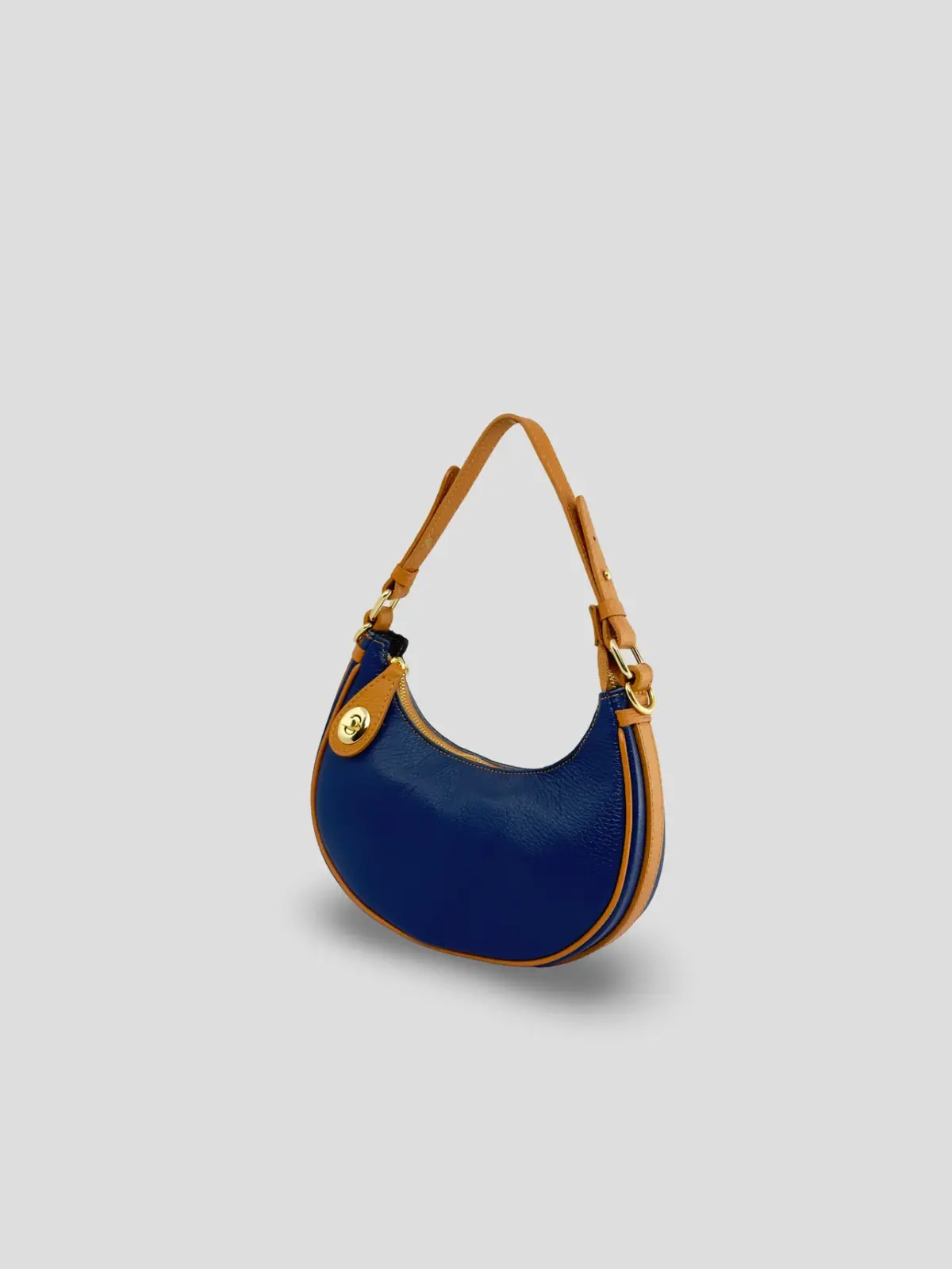 Il manico ampio distribuisce il peso in modo confortevole, mentre la linea curva crea un elemento distintivo che la rende immediatamente riconoscibile. Questa combinazione tra comfort e carattere la distingue dalle borse convenzionali.